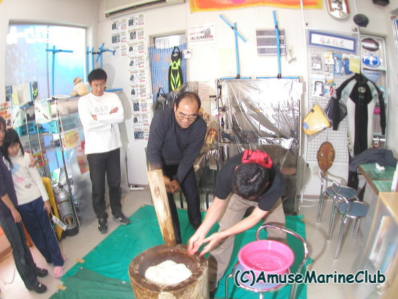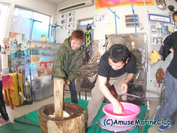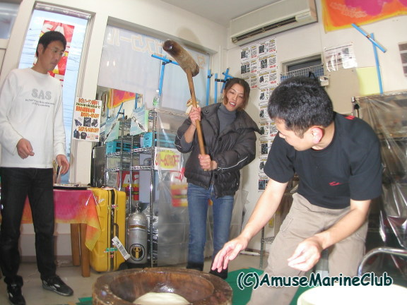 2005年1月3日にアミューズ初の試みである餅つき大会を実施しました。足袋抜家秘蔵の杵と臼で6升ものお餅をつきあげました。大勢の方にご参加いただきありがとうございました。なかなか思い出に残るイベントになりました。今後は恒例化させていきたいと思います。餅つき大会終了後は年末ジャンボ宝くじ開封パーティーで大いに盛り上がりました。今日からスタッフ研修ツアーでパラオに6日間行ってまいります。その間HPの更新はできませんが、今回留守番の能崎が毎日日記を更新すると張り切っておりますので毎日チェックしてくださいね。また、パラオのインターネットカフェから掲示板にツアーリアル報告も書き込みたいと思いますので、そちらもチェックしてね!! |